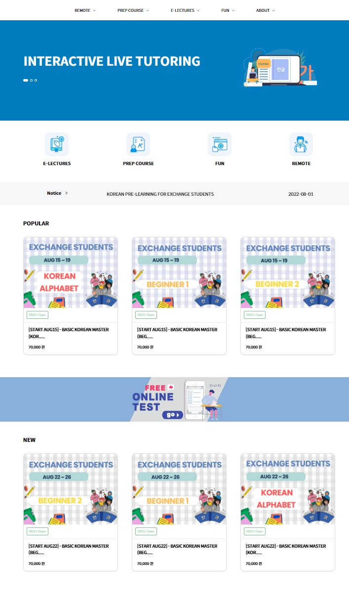 Global E&S runs Korean language programs with both in-person and online classes (“www. teachmekorea.com”). Students can enjoy learning Korean through the conversation-focused course at the language center in Seoul and enjoy both the remote options and e-lectures of the Korean language we provide for international students. With LMS (Learning Management System), we provide systematic Korean language education taught by remarkable masters and doctoral instructors who graduated from major Korean universities.